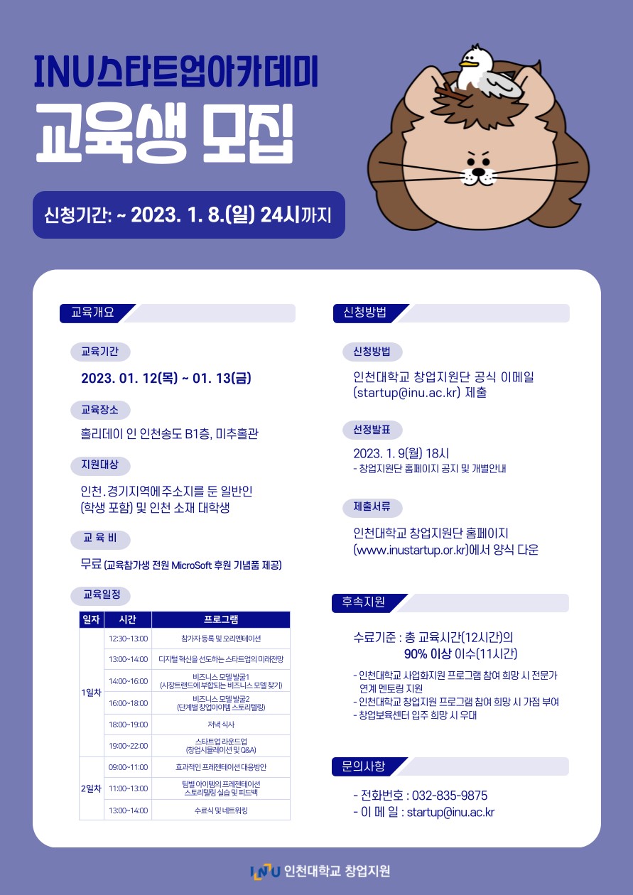 상기 일정은 인천대학교 창업지원단 내부사정으로 변경될 수 있습니다.