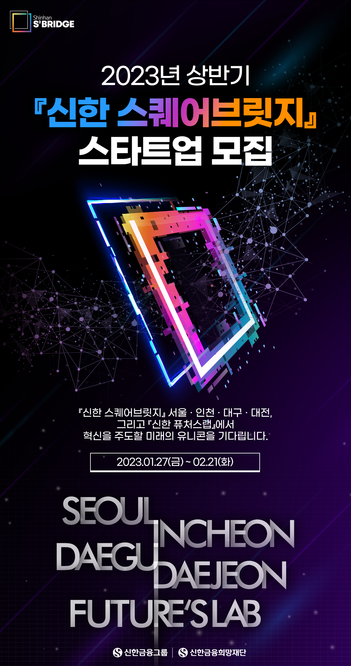신한금융그룹 스타트업 육성 플랫폼 『신한 스퀘어브릿지』 서울, 인천, 대구, 대전, 그리고 『신한 퓨쳐스랩』과 함께 성장할 스타트업을 모집합니다.