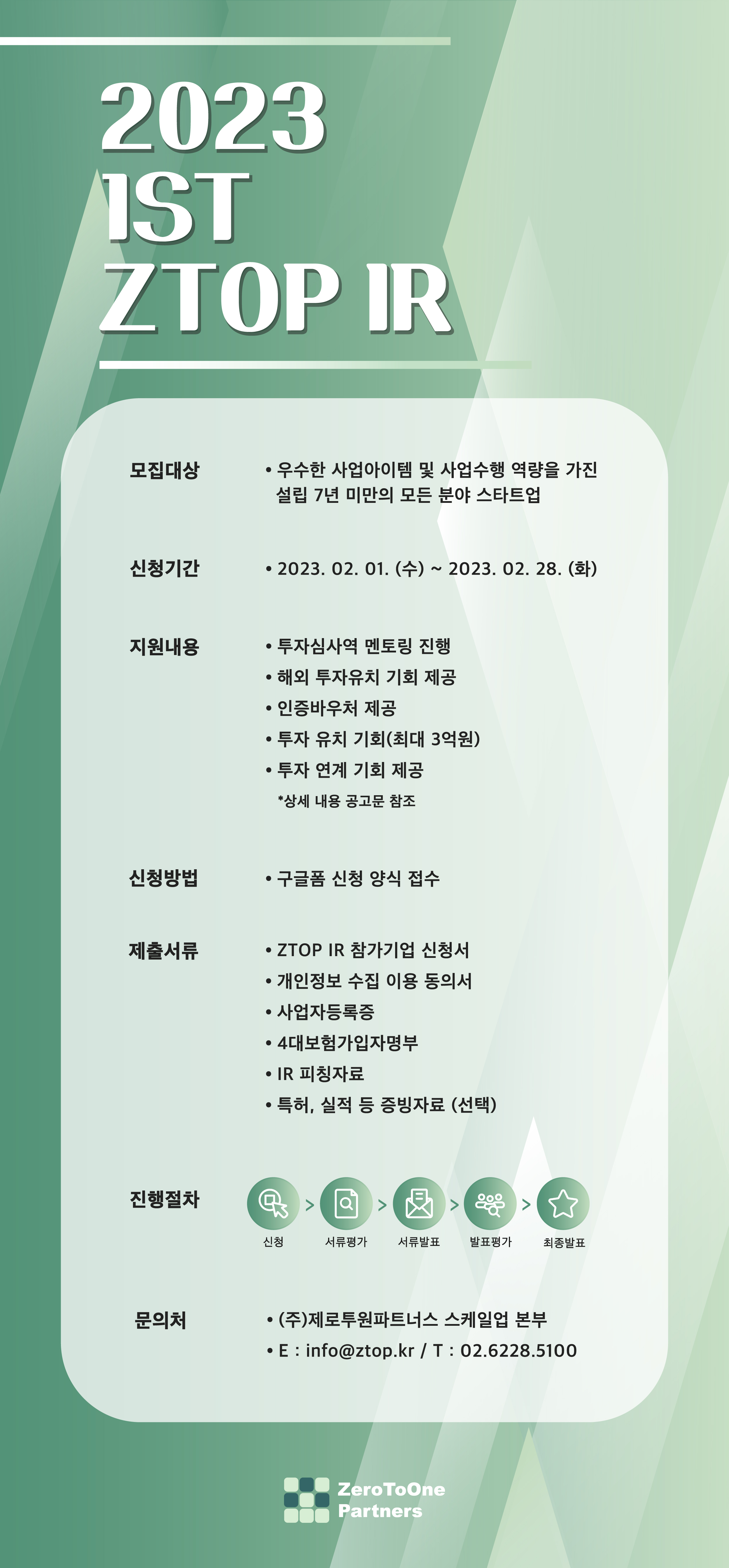 2023년 1st ZTOP(지탑) IR 참여 및 투자 유치 기회(최대 3억원) 및 투자 연계 기회 제공