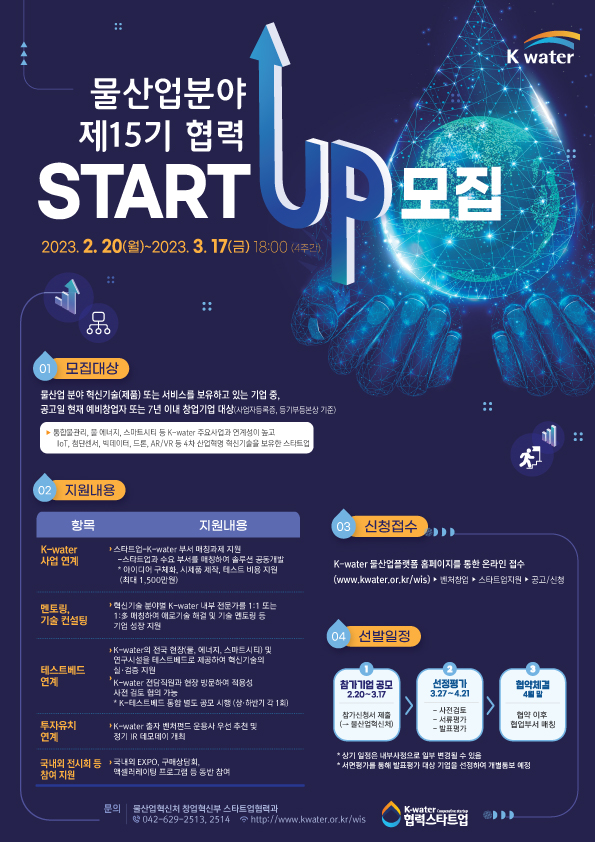 K-water 기술·연구인력을 매칭하여 멘토링, 협업과제 수행, 테스트베드와 연계한 기술 실·검증, 투자유치 연계 등 맞춤형 지원