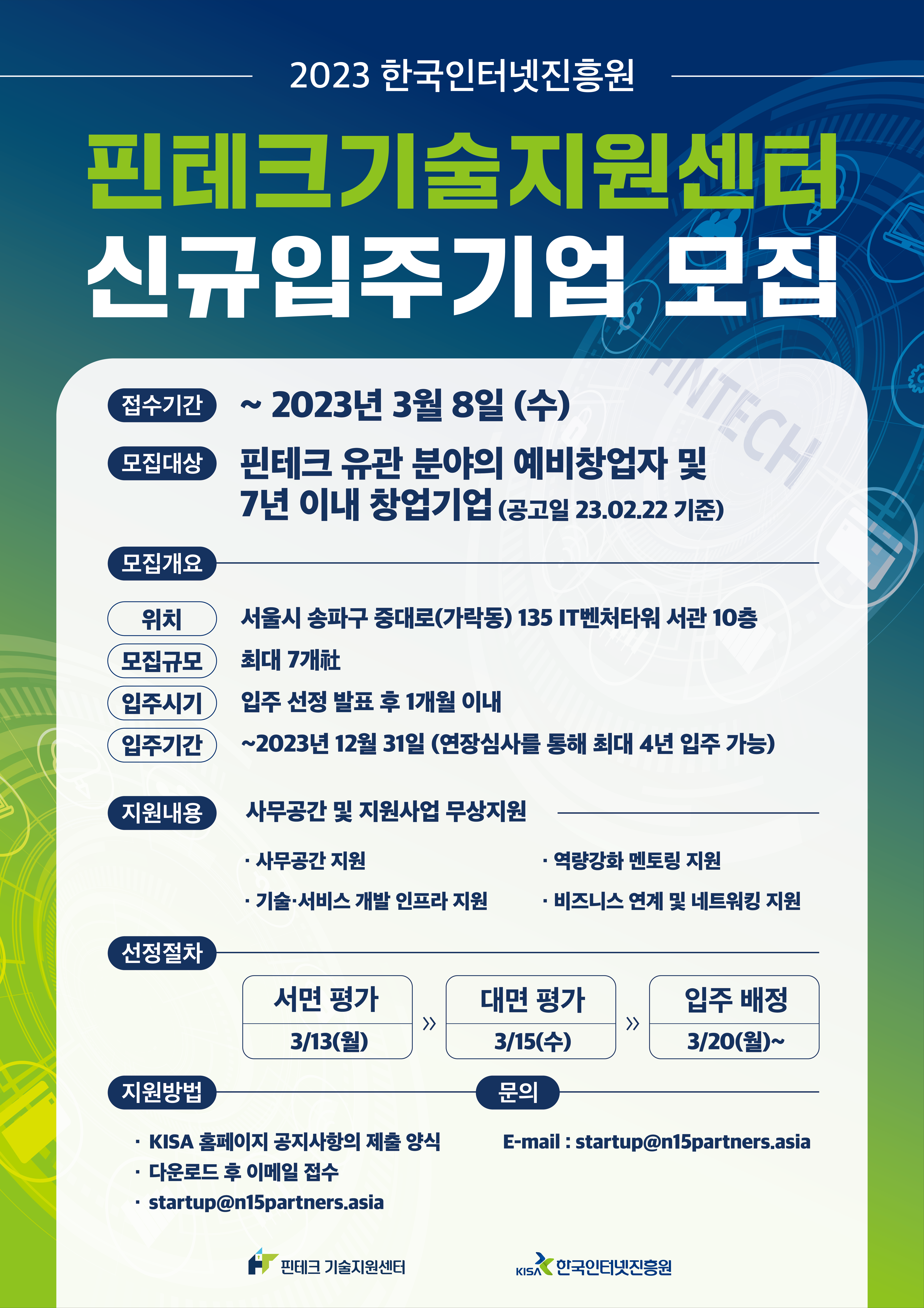 KISA 핀테크 기술지원센터 입주기업 모집개요