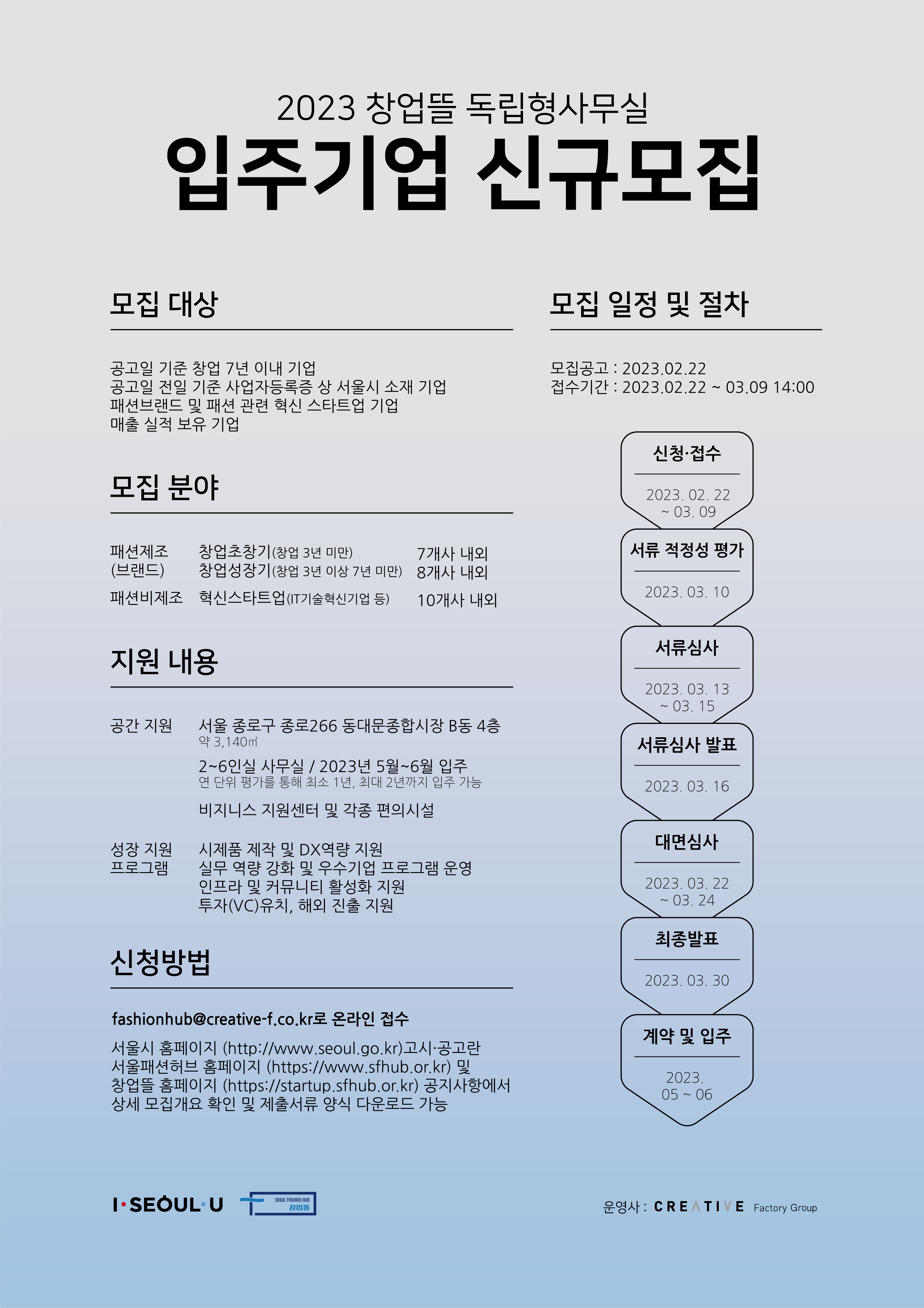 서울패션허브 창업뜰 운영팀 : 02-2285-6664 / fashionhub@creative-f.co.kr