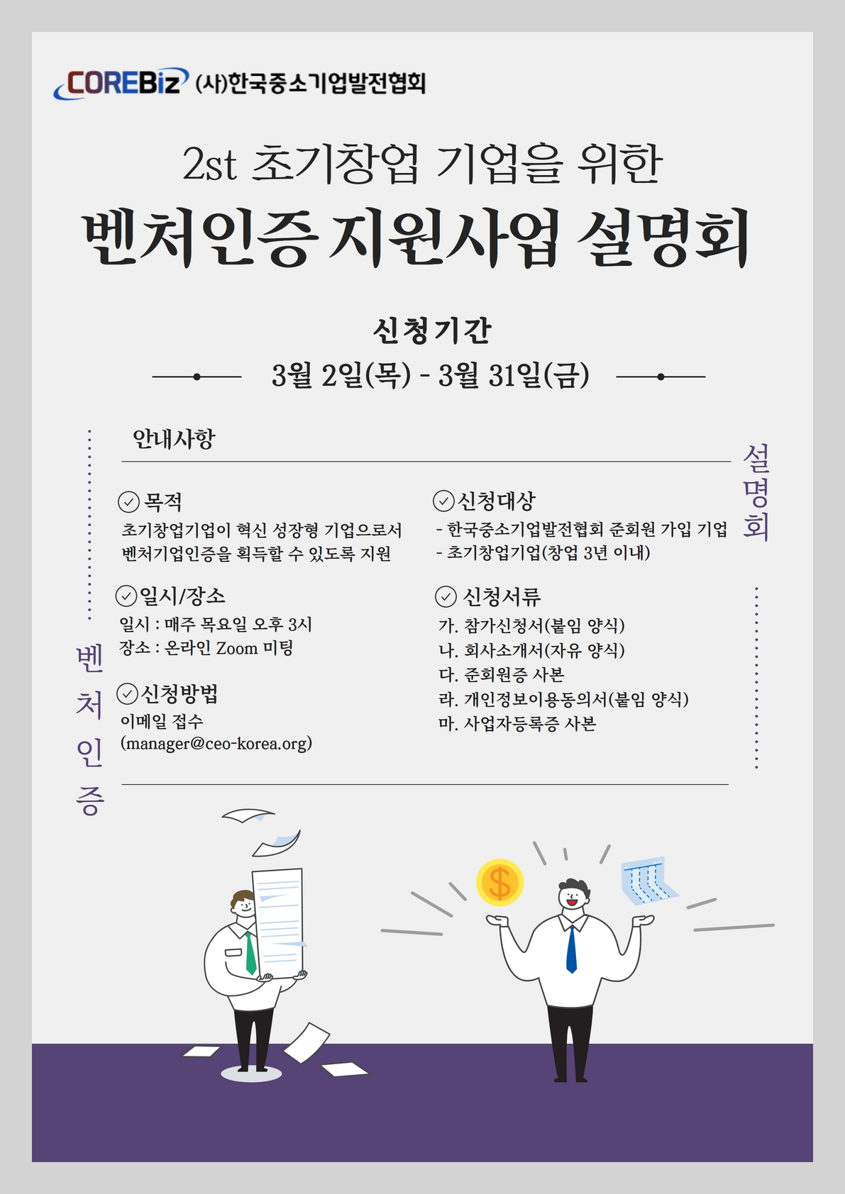 초기창업기업이 혁신 성장형 기업으로써 벤처기업인증을 획득할 수 있도록 서비스 지원