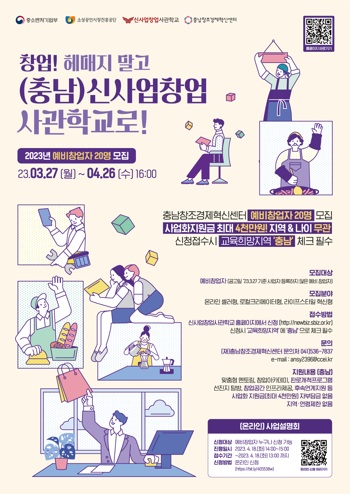 - 창업상담‧지도 및 코칭, 아이디어 피칭, 창업아카데미, 선진지 탐방, 판로개척 프로그램, 창업공간 인프라 제공 등