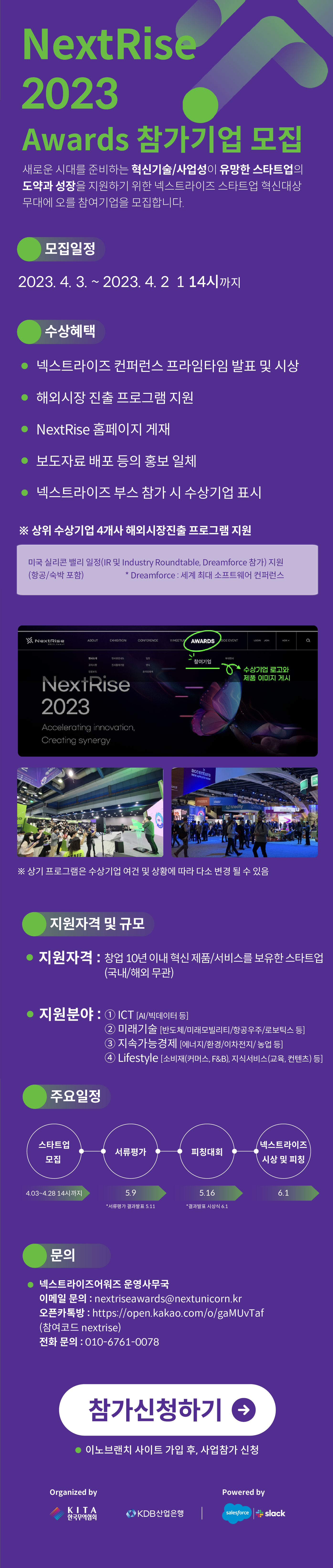 한국무역협회는 한국산업은행과 공동으로 국내 최대 스타트업 페어 '넥스트라이즈 2023, 서울'을 오는 6월 1일 ~ 6월 2일 양일간 서울 삼성동 코엑스에서 개최합니다. 스타트업의 성장을 지원하기 위한 NextRise2023, Seoul Awards무대에 오를 기업을 모집합니다.