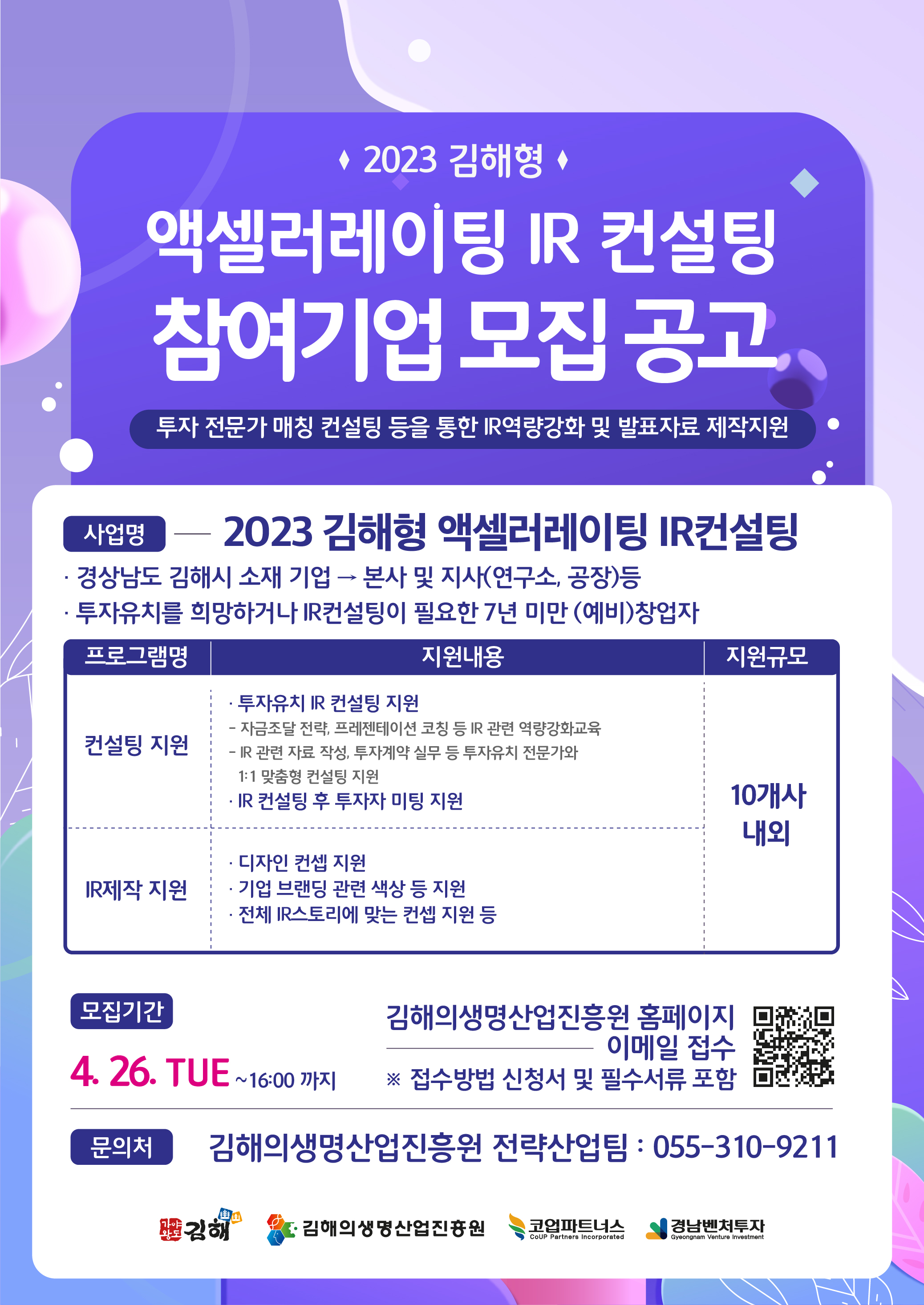 경남 김해시 지역 내 투자유치를 희망하거나 IR컨설팅이 필요한 7년 이내 창업기업
