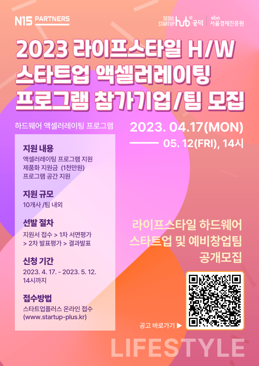 라이프스타일 하드웨어 액셀러레이팅 프로그램 제공 / 코워킹스페이스 지원 / 제품화 지원금(기업당 최대 1천만원)