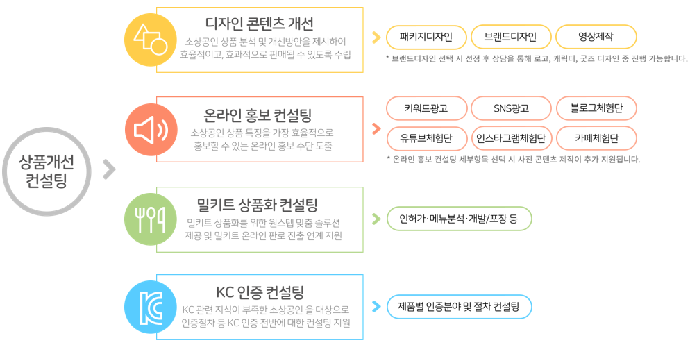 디자인 콘텐츠 개선, 온라인 홍보 컨설팅, 밀키트 상품화 컨설팅, KC 인증 중 택 1