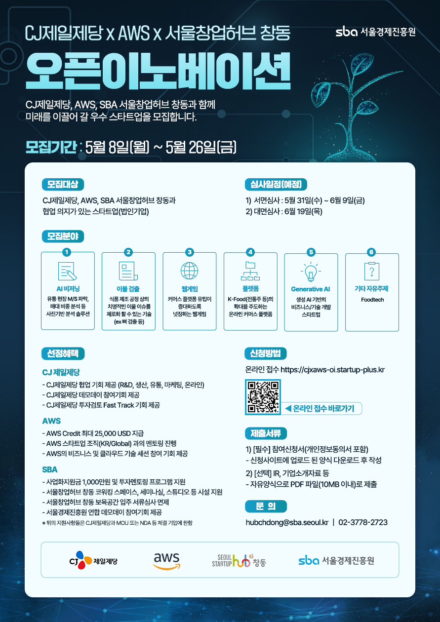 CJ제일제당, AWS, SBA 서울창업허브 창동과 협업 의지가 있는 스타트업(법인기업)
