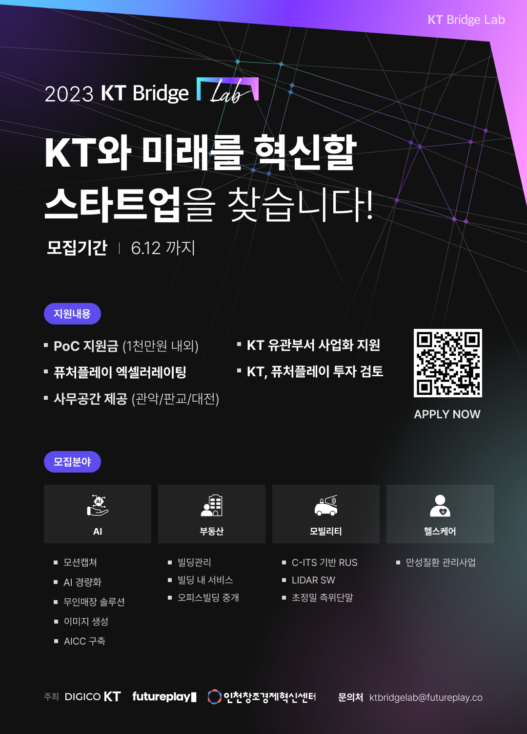 - 모집분야 : 모션캡처, 만성질환 관리사업, AI 경량화, 빌딩관리 솔루션, 빌딩 내 퀵/화물 서비스, 이미지생성 AI, C-ITS 기반 RSU, LiDAR 소프트웨어, 초정밀 측위단말, 무인매장용 비전솔루션, AICC 구축협업, 오피스 중개플랫폼 등 -