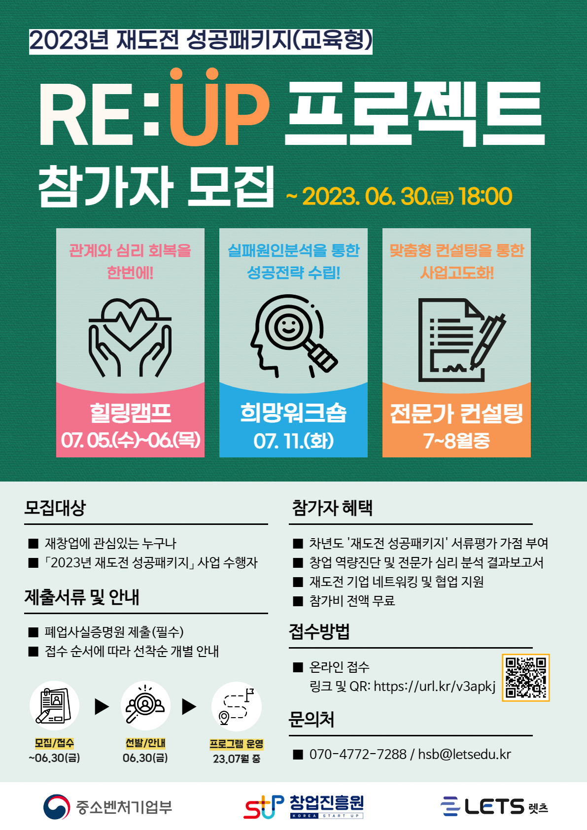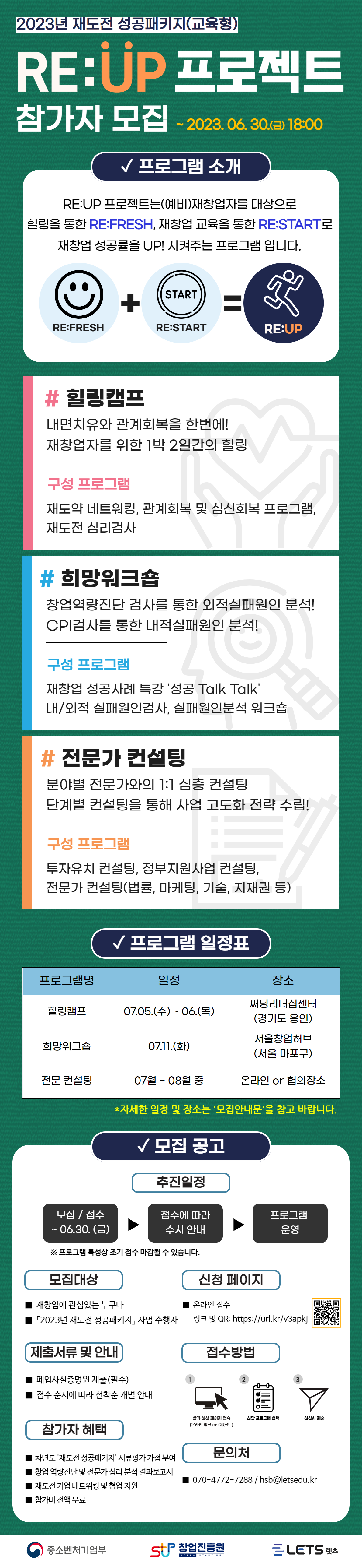 모집/접수(~ 06.30.(금) 18:00) → 프로그램별 수시 안내 → RE:UP프로젝트 (일정별 진행, 3개 프로그램) → 수료증 발급(8월 중)