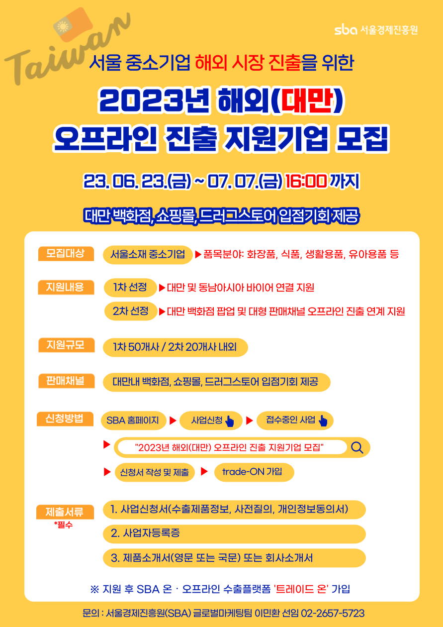- (2차 선정대상) 대만 백화점 팝업 또는 대형판매채널 오프라인 진출 연계 지원