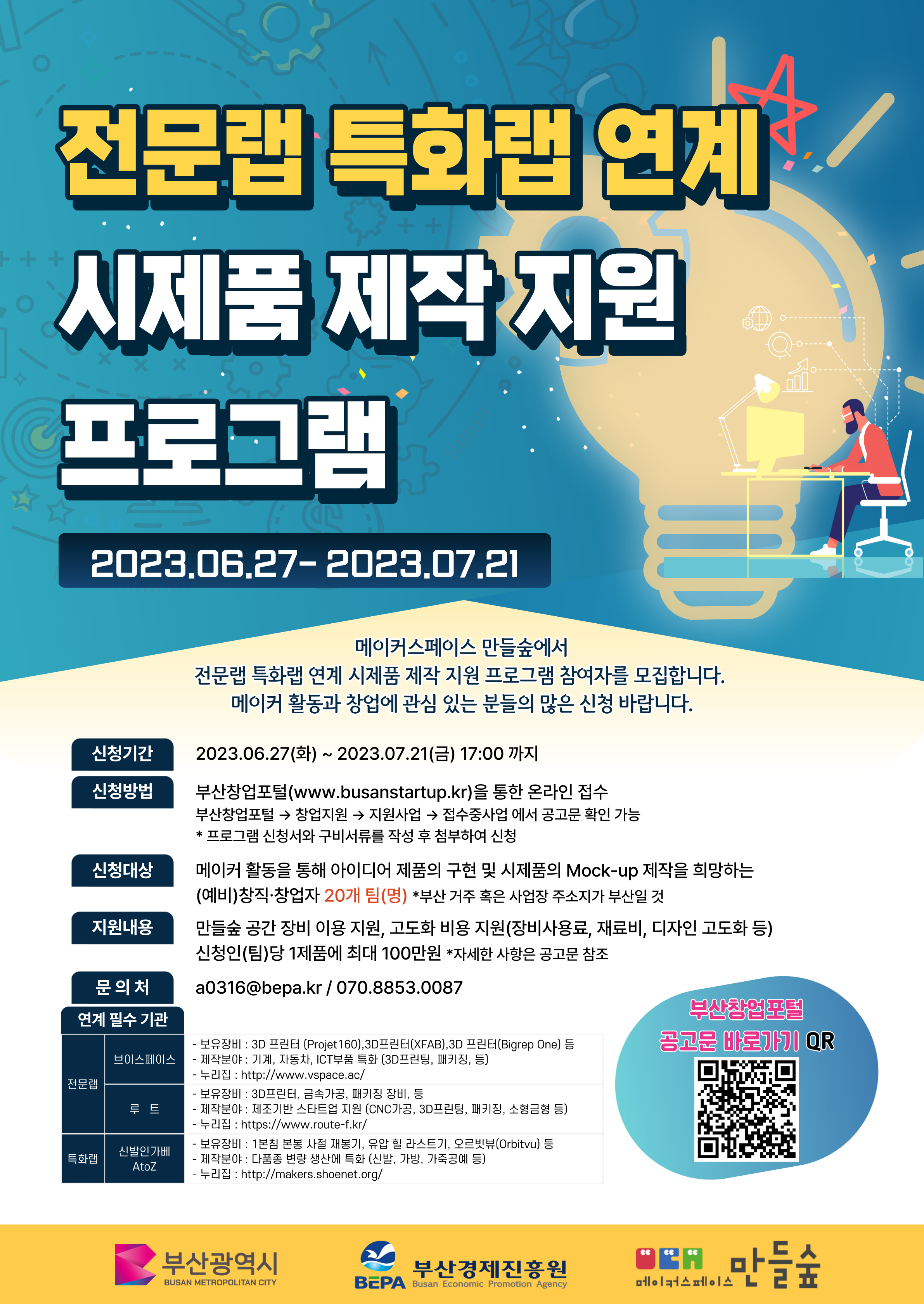 만들숲 공간 장비 이용 지원, 고도화 비용 지원(장비사용료, 재료비, 디자인 고도화 등) 신청인(팀)당 1제품에 최대 100만원