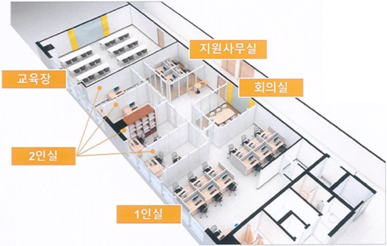 1. 센터 입주공간 : 2인실 4개실 (총 8석), 다인실(파티션) 1인석 총 12석 총 20석 (지정석 19, 자유석 1)