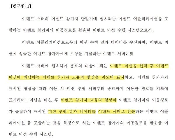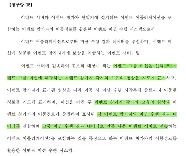 청구항 1항은 개인이 이벤트 미션을 수행하는 경우에 해당한다. 청구항 15항은 여러 명이 이벤트 그룹 미션을 선택하여 그룹 미션을 수행하는 경우에 해당한다.