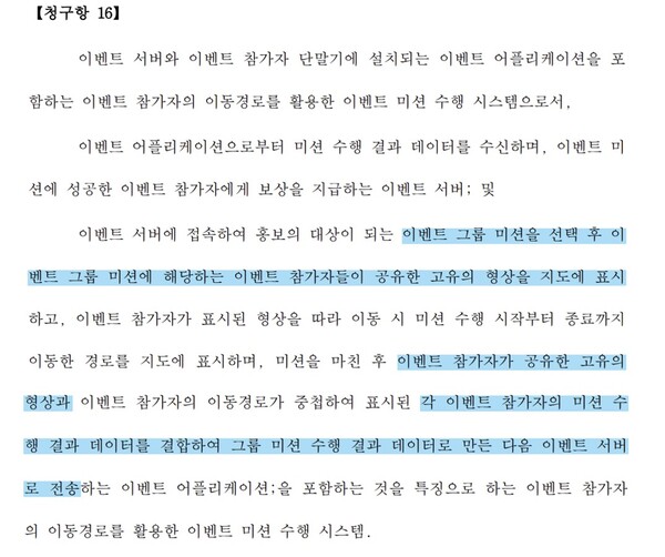 청구항 16항은 이벤트 그룹 미션을 선택 후 그룹 미션 이벤트 참가자들이 공유한 고유의 형상을 이용한다. 이벤트 그룹 미션을 선택하는 점에서 청구항 15항과 동일하나, 이벤트 참가자들이 공유한 고유의 형상을 지도에 표시하는 점에서 청구항 15항과 다르다.