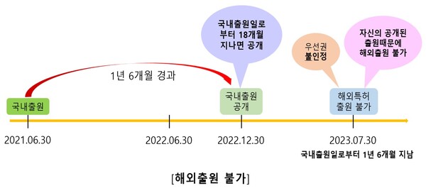 대한민국 특허출원 후 1년 6개월이 경과하여 대한민국에서 자신의 특허가 공개되었다면 대한민국 특허와 동일한 특허를 미국이나 기타 외국에 출원할 방법은 없다(위의 ‘해외출원 불가’ 참고).