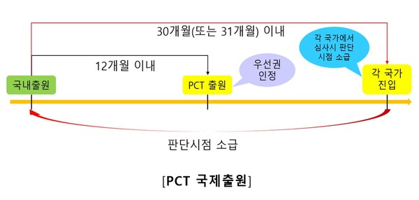 PCT의 경우도 대한민국 출원일로부터 1년 내에 PCT 국제출원을 하면서 우선권주장을 하면 각 나라에 진입하여 특허요건을 판단 받을 때 대한민국 특허청의 출원일로 소급하여 판단 받을 수 있다. 이때 우선권주장은 위에서 살펴본 조약우선권 주장이 아니라 국내 우선권주장이라고 한다.