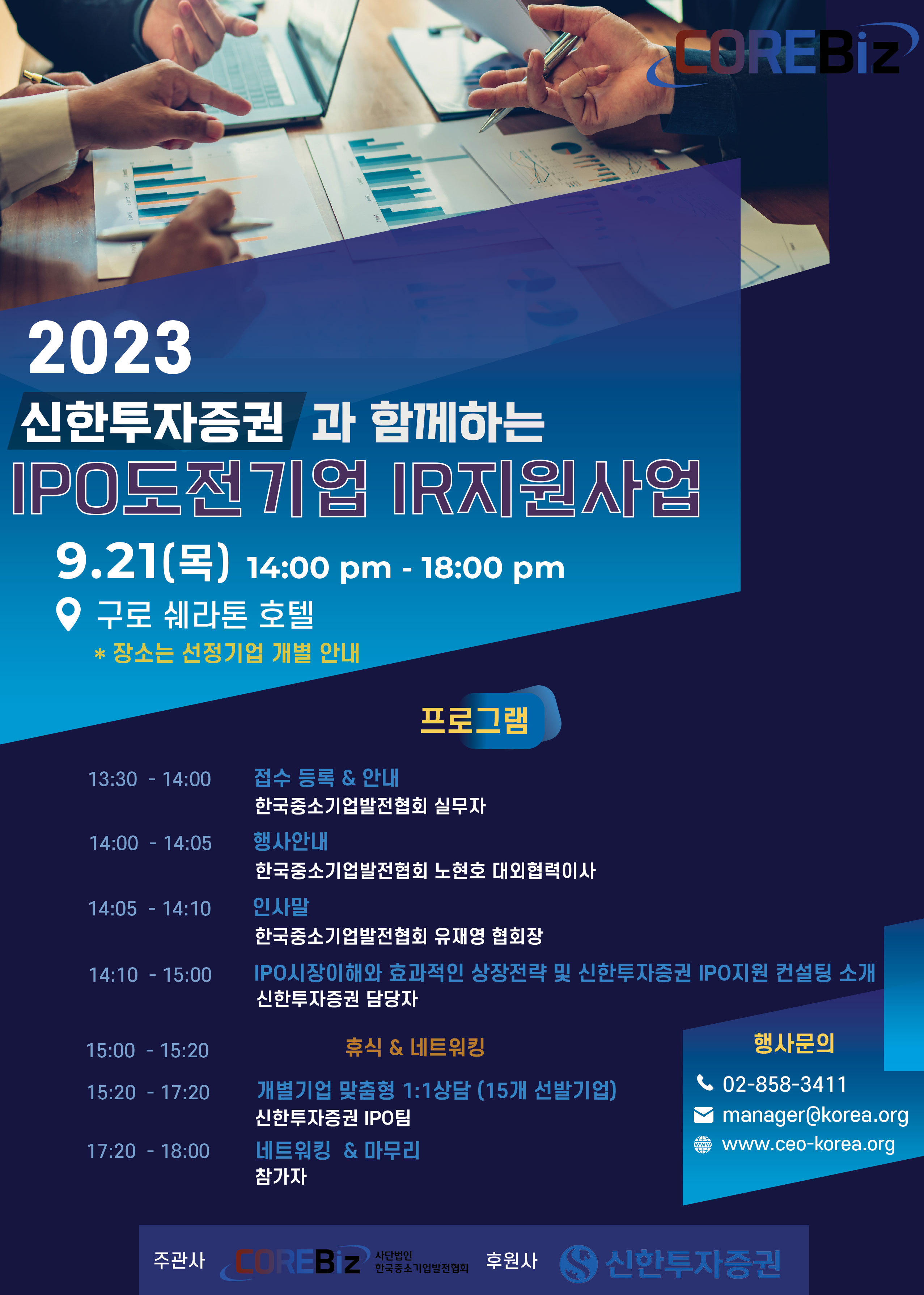 ❍ 15 : 00 ~ 15 : 20 → 2부(개별기업 맞춤형 1:1상담, 신한투자증권 IPO팀)