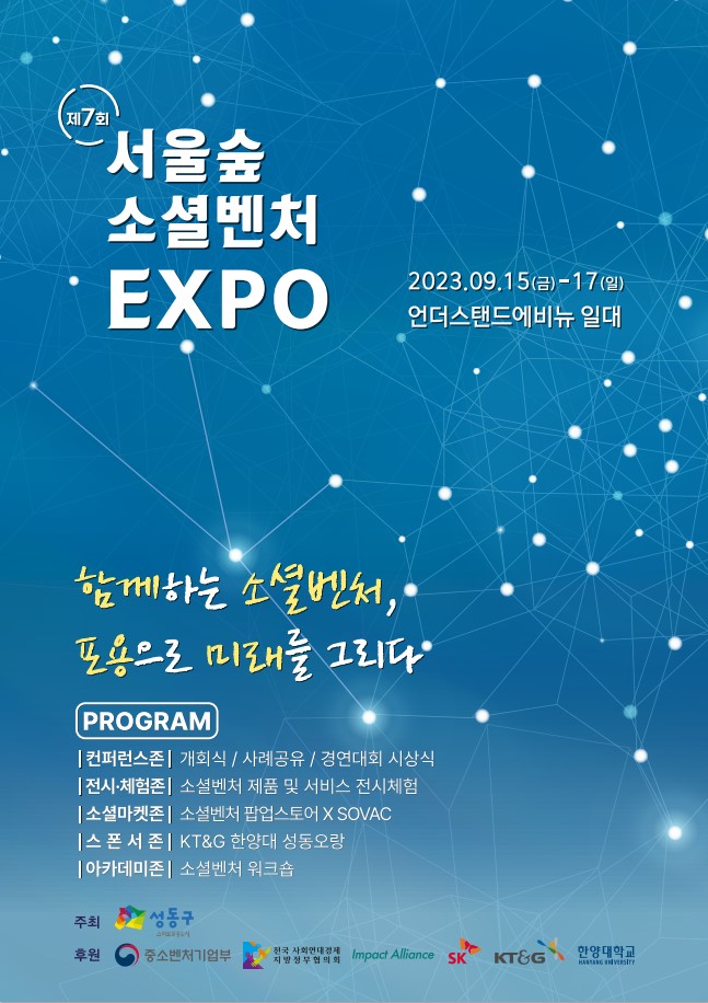 혁신적인 일자리 창출과 사회적 가치 실현을 추구하는 소셜벤처 축제의 장 「제7회 서울숲 소셜벤처 EXPO」를 성수동 언더스탠드에비뉴 일대에서 개최합니다.