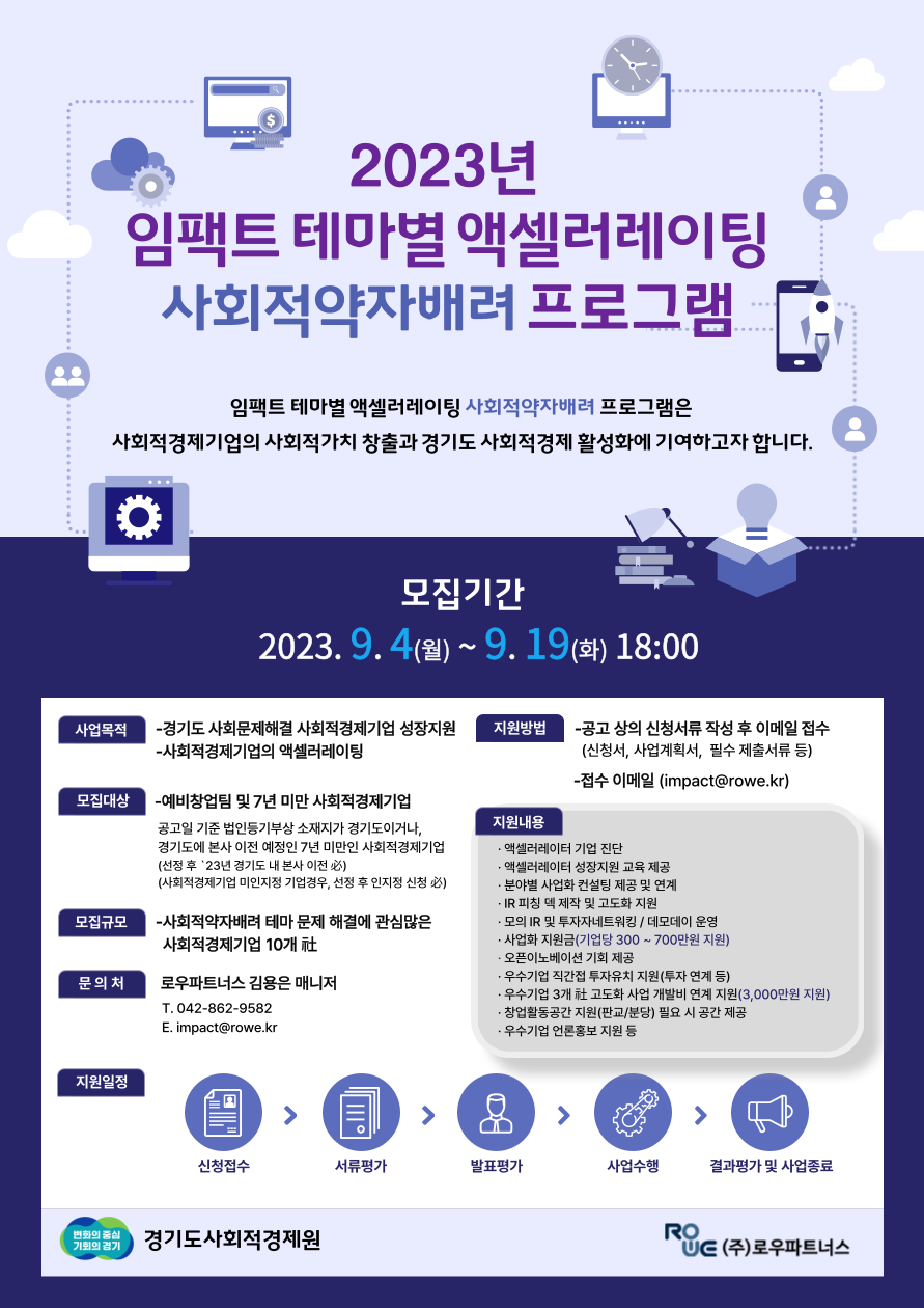 - 경기도 내 사회문제해결(사회적약자배려) 분야 예비창업자 및 7년 미만 사회적경제기업(소셜벤처 포함)
