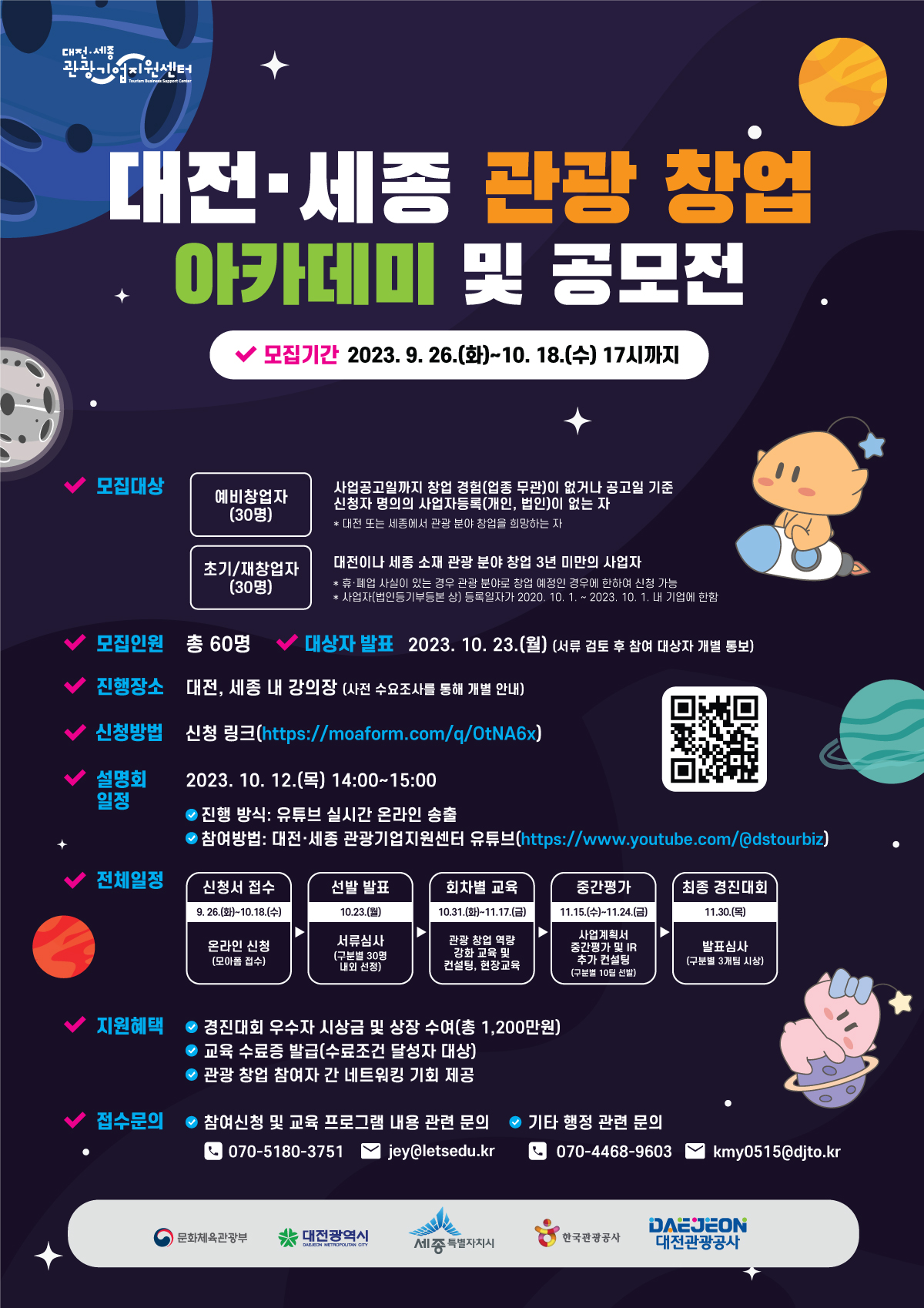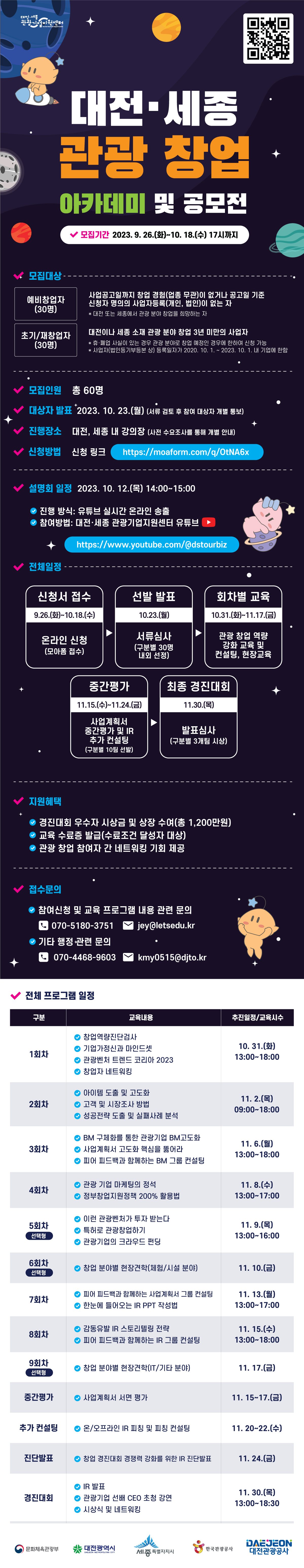 대전·세종 관광 분야 예비 창업자, 초기/재창업자 개인 또는 4명 이내 팀