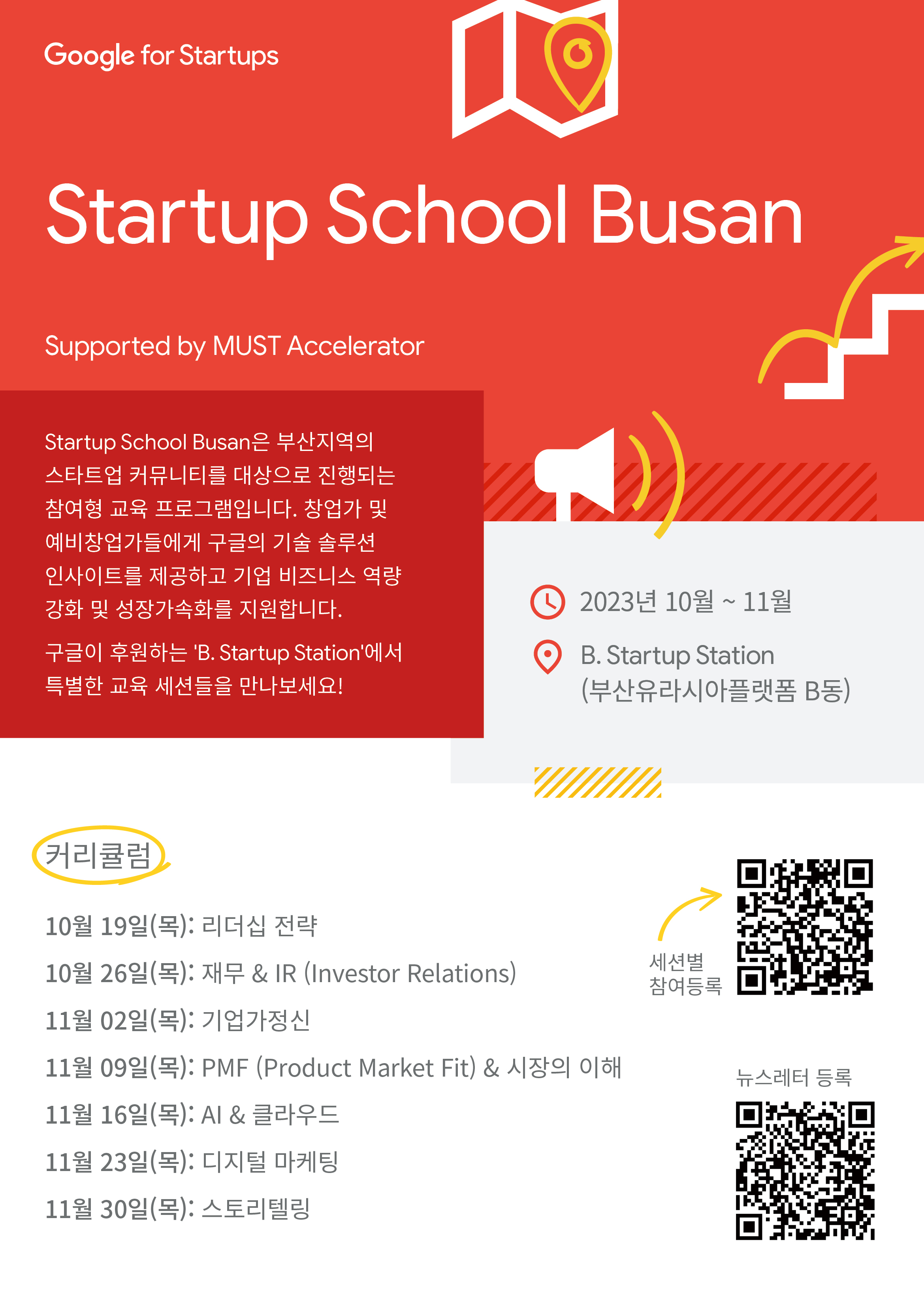 '스타트업 스쿨 부산'은 구글 스타트업 캠퍼스와 머스트액셀러레이터, 부산시가 함께 하는 스타트업 참여형 교육 프로그램입니다.