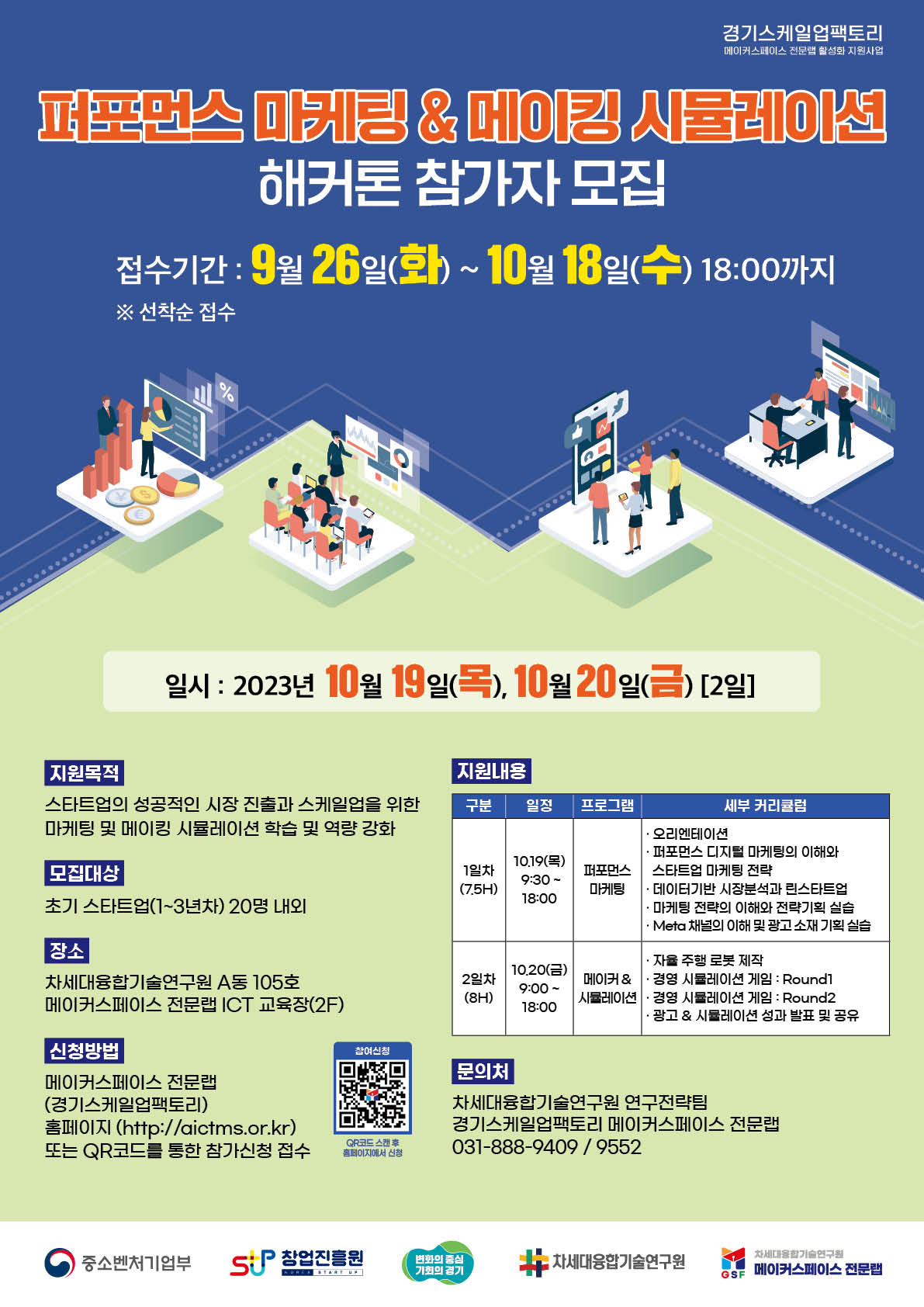- 메이커스페이스 전문랩 경기스케일업팩토리 홈페이지(https://aictms.or.kr)를 통한 On-line 접수 또는 QR코드를 통한 참가신청 접수