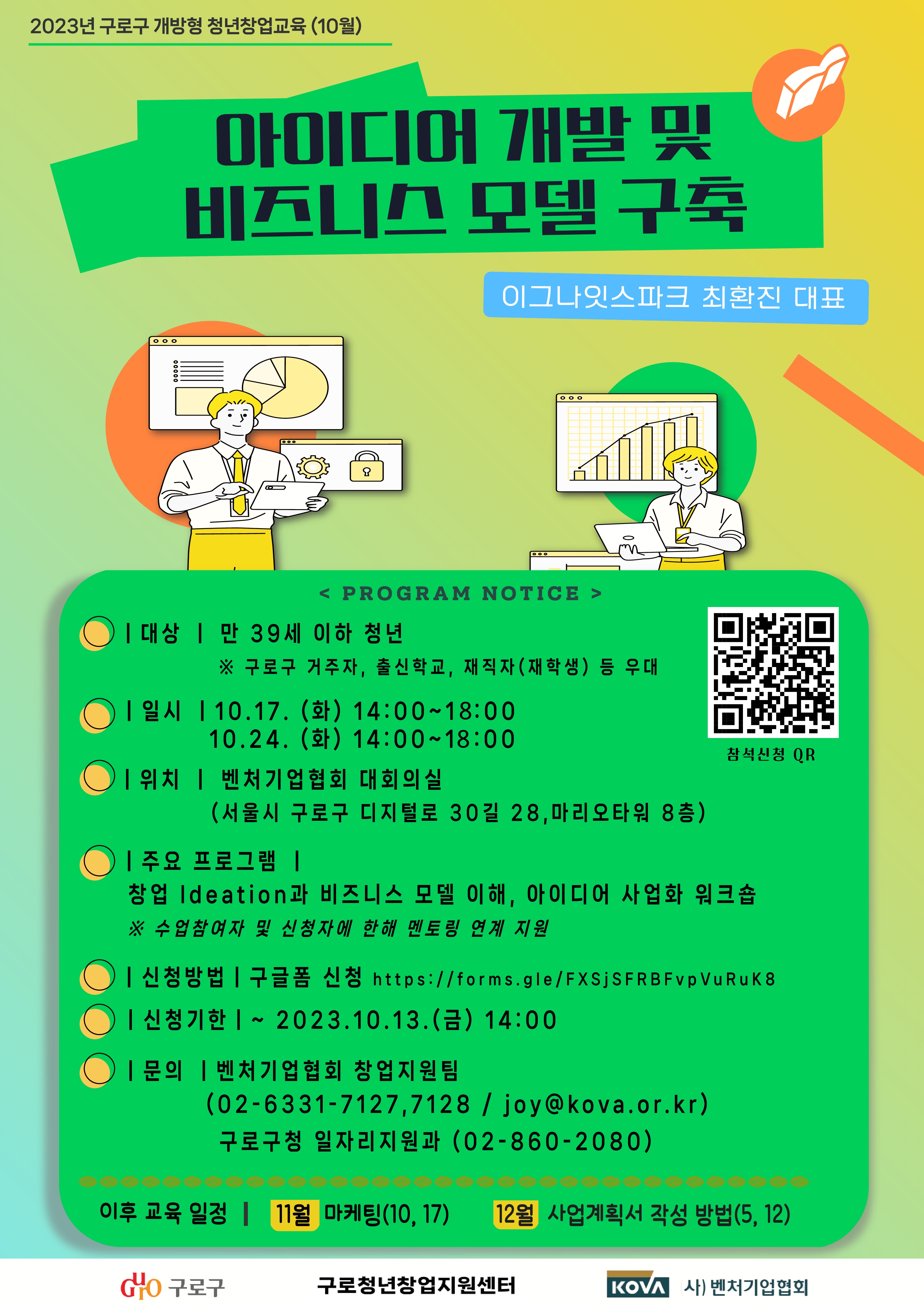 - 내용 : 창업 Ideation과 비즈니스 모델 이해, 아이디어 사업화 워크숍 실습