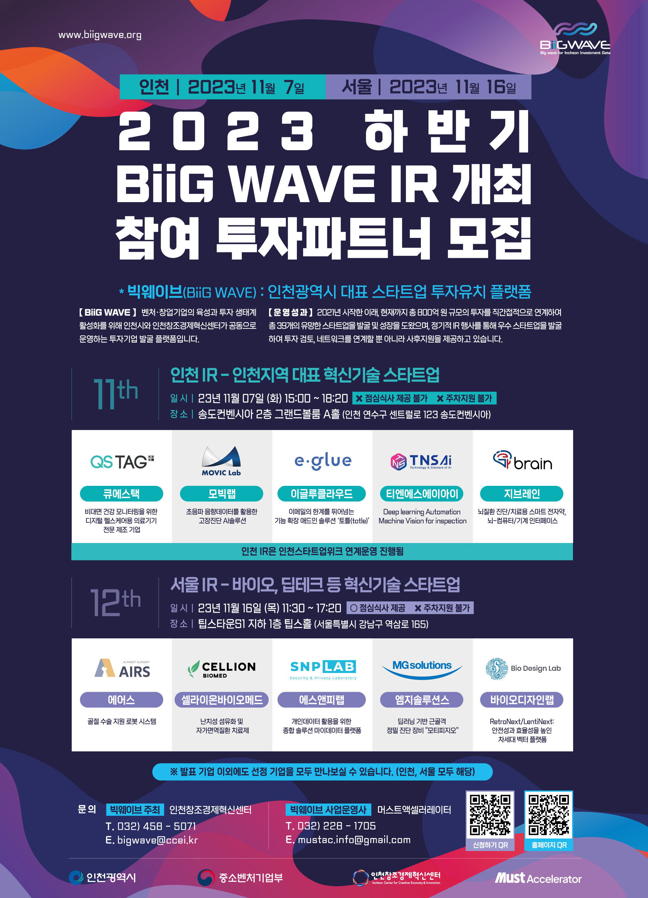 '2023 하반기 투자기업 발굴 플랫폼 빅웨이브 IR 참여 투자사모집 [인천IR 11/07],[서울IR 11/16]