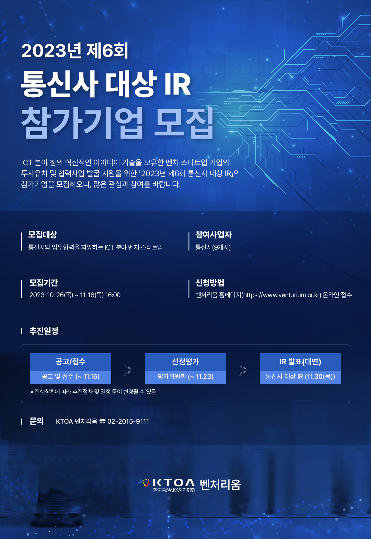 - ICT 분야의 창의 혁신적 아이디어와 기술을 보유한 유망 벤처스타트업 기업에게 국내 '통신사 대상 IR'을 통한 업무협력 지원