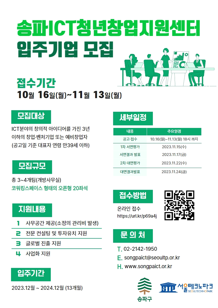 - 서울시 송파구 중대로 135, IT벤처타워 서관 11층, 송파ICT청년창업지원센터