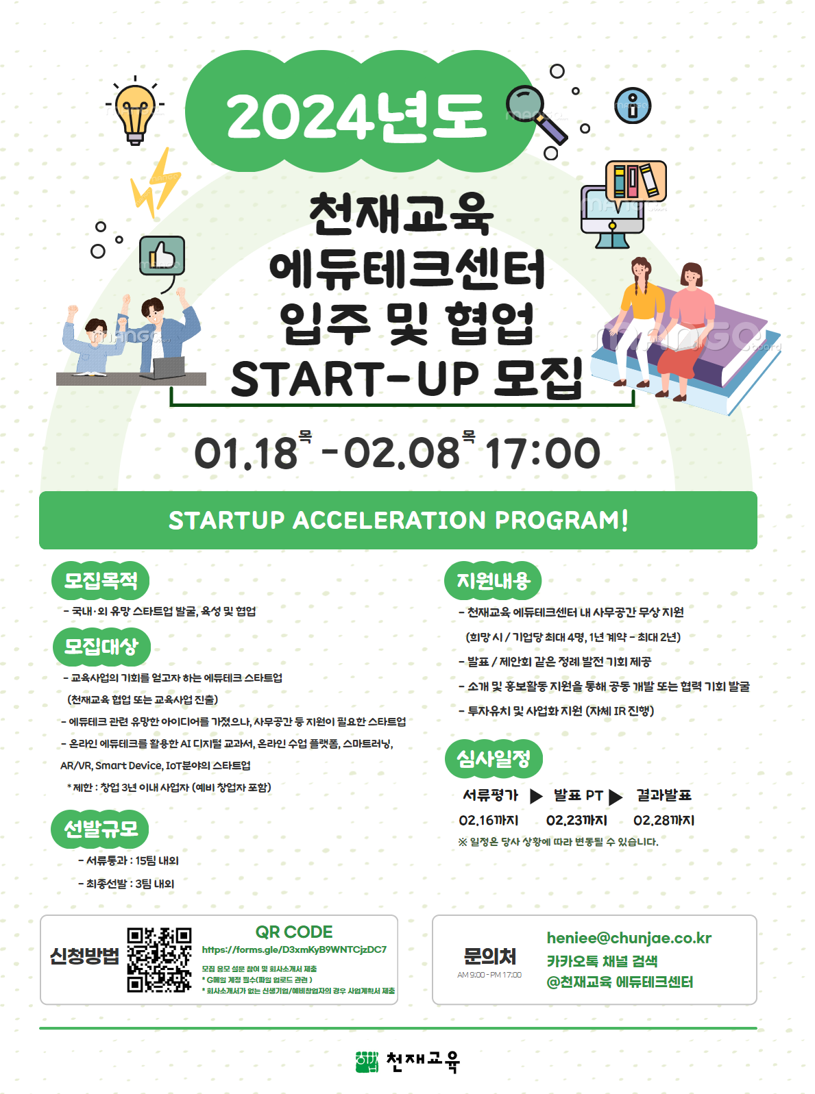 - 모집 공고 관련한 자세한 문의는 이메일 또는 카카오톡(천재교육 에듀테크센터 공식 채널)으로 문의하시기 바랍니다.