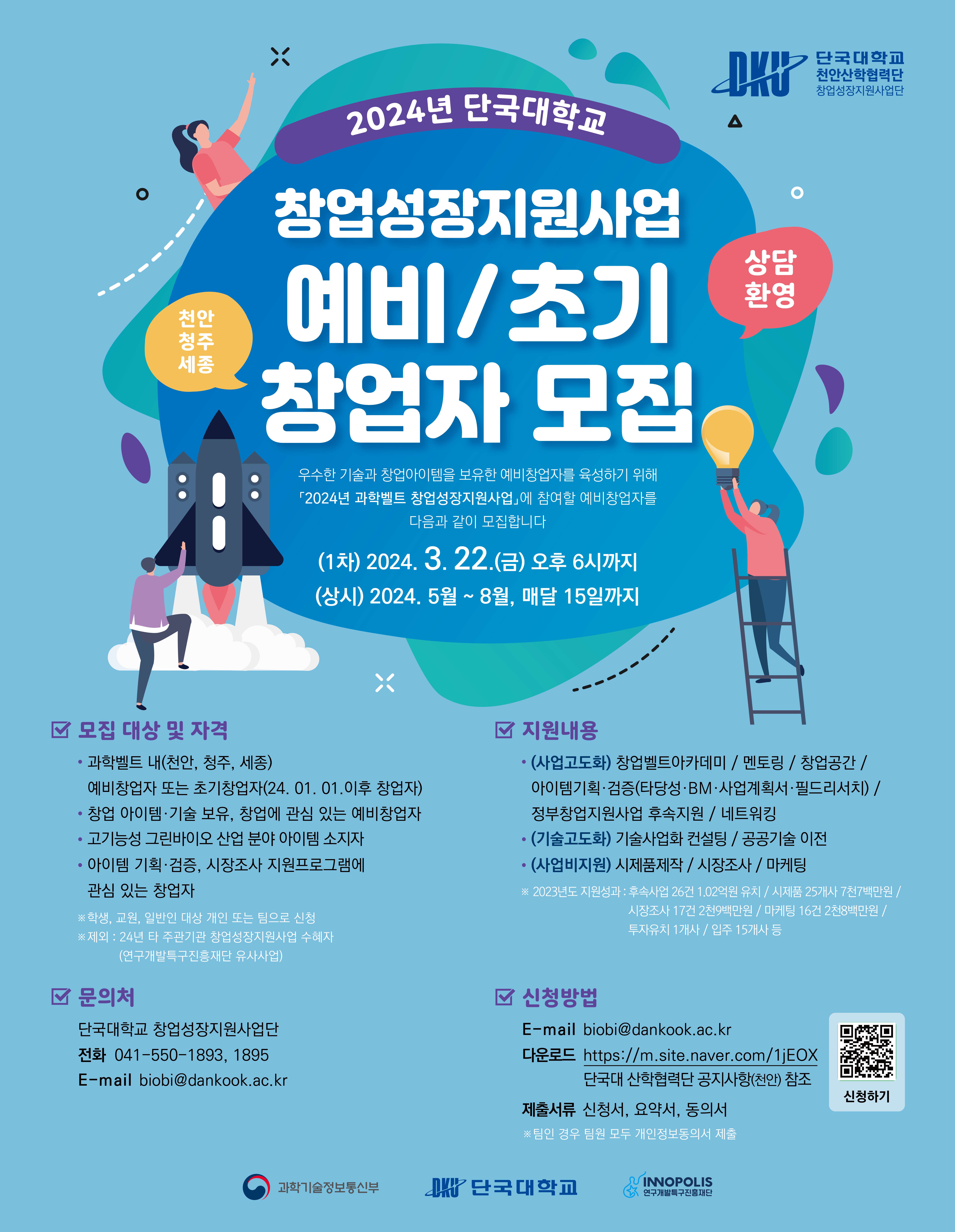 과학기술정보통신부, 연구개발특구진흥재단에서 지원하는 단국대학교 창업성장지원사업단에서는 3월 22일까지 우수한 기술과 창업아이템을 보유한 예비창업자를 모집하오니 많은 참여바랍니다.