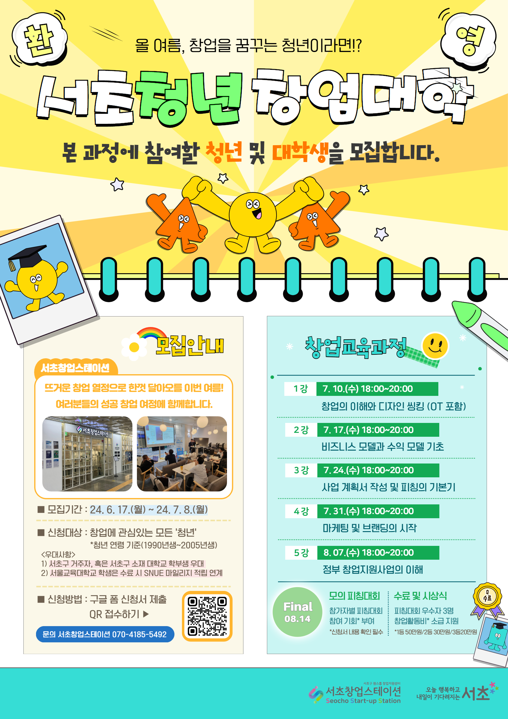 파이널 피칭대회 : 2024년 8월 14일(수) 18:00~20:00, 참가자 개인별 피칭대회 참가 자격 부여, 서초창업스테이션 홀, 교육비 무료