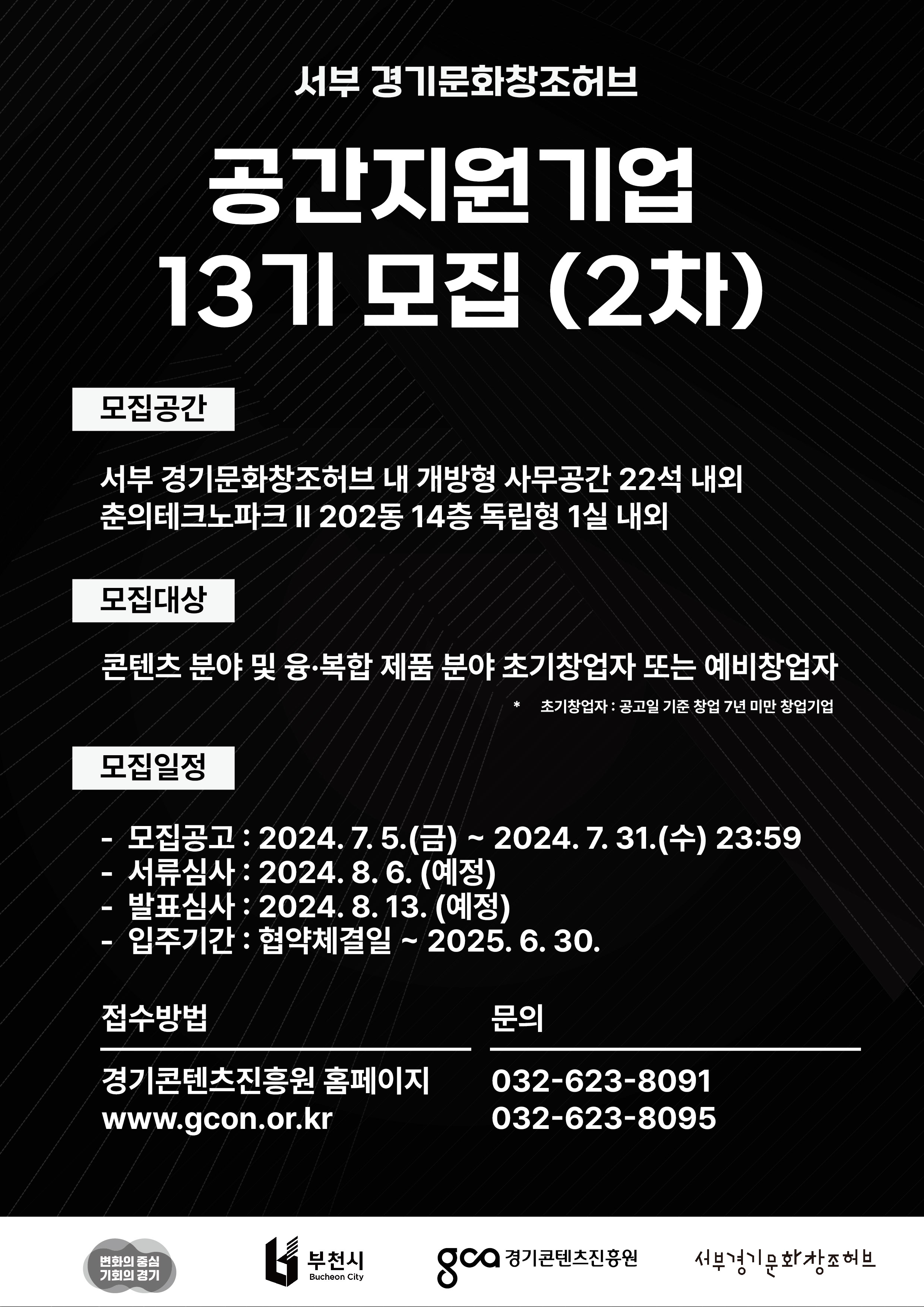 - 소재지 : 경기도 부천시 부천로198번길 18, 춘의테크노파크Ⅱ 202동 10층 서부 경기문화창조허브