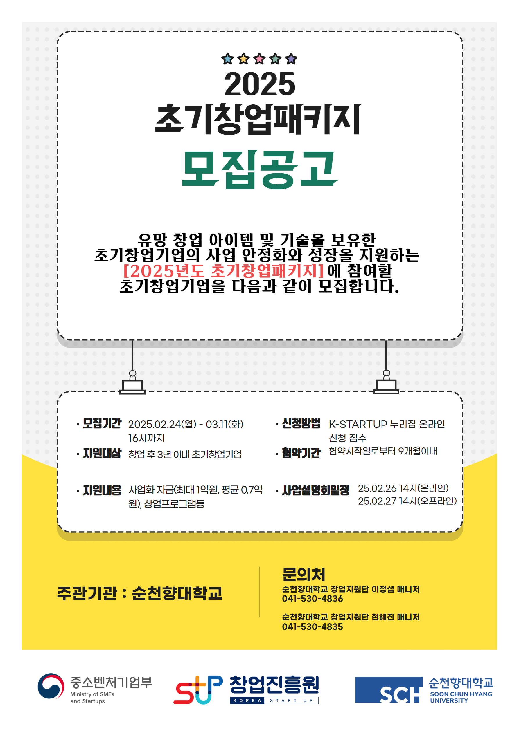 유망 창업 아이템 및 기술을 보유한 초기창업기업의 사업 안정화와 성장을 지원하는 [2025년도 초기창업패키지]에 참여할 초기창업기업을 다음과 같이 모집합니다.