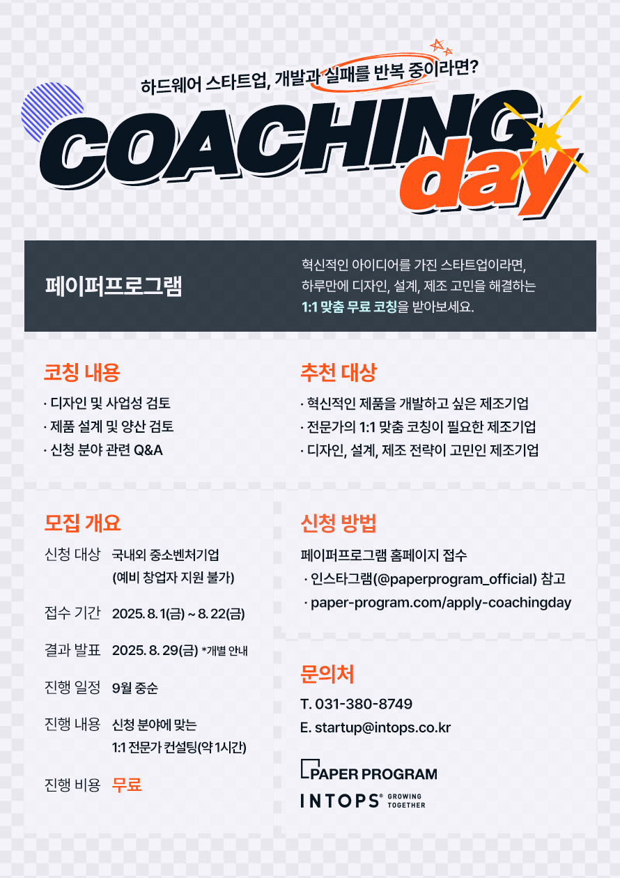 인탑스의 페이퍼프로그램은 하드웨어 스타트업이 직면하는 다양한 문제를 해결해 드리고자 무료 1:1 원데이 컨설팅 '코칭데이'를 매월 개최하고 있습니다. 주요 프로젝트를 리드하며 많은 경험과 노하우를 쌓은 제품 디자인 / 설계 제조 전문가들이 함께합니다. 자유로운 질문과 답변으로 궁금증을 해소하고, 여러분 스스로 해결책을 발견하고 실행할 수 있는 프로세스를 공유합니다.