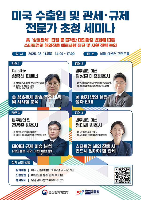 오는 8월 11일(월), 서울 양재동 aT센터 그랜드홀에서 美 '상호관세' 타결로 인해 글로벌 공급망 재편 등 급격한 대외환경 변화에 따른 스타트업의 해외진출 등 애로사항 진단 및 지원 전략 논의를 위한 「미국 수출입 및 관세·규제 전문가 초청 세미나」를 개최하고자 합니다.