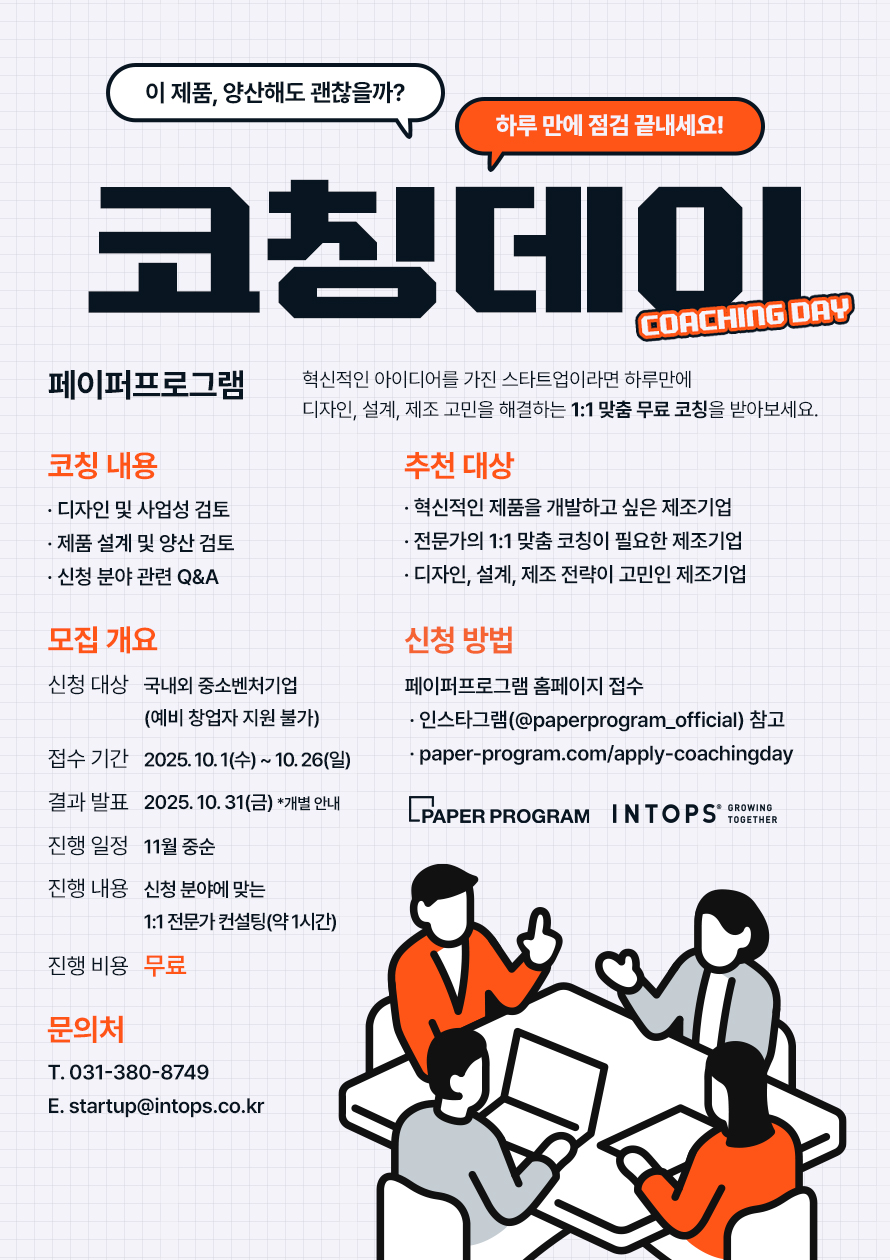 인탑스의 페이퍼프로그램은 하드웨어 스타트업이 직면하는 다양한 어려움을 실질적으로 지원하기 위해 매월 무료 1:1 원데이 컨설팅 ‘코칭데이’를 운영하고 있습니다.