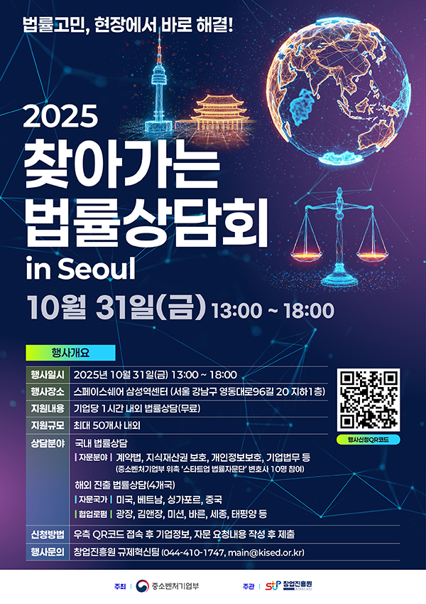 창업기업을 위한 「2025년 찾아가는 법률상담회(서울)」를 아래와 같이 개최합니다. 국내 핵심 법무 이슈부터 미국·베트남·싱가포르·중국 진출까지 한 자리에서 점검하세요.